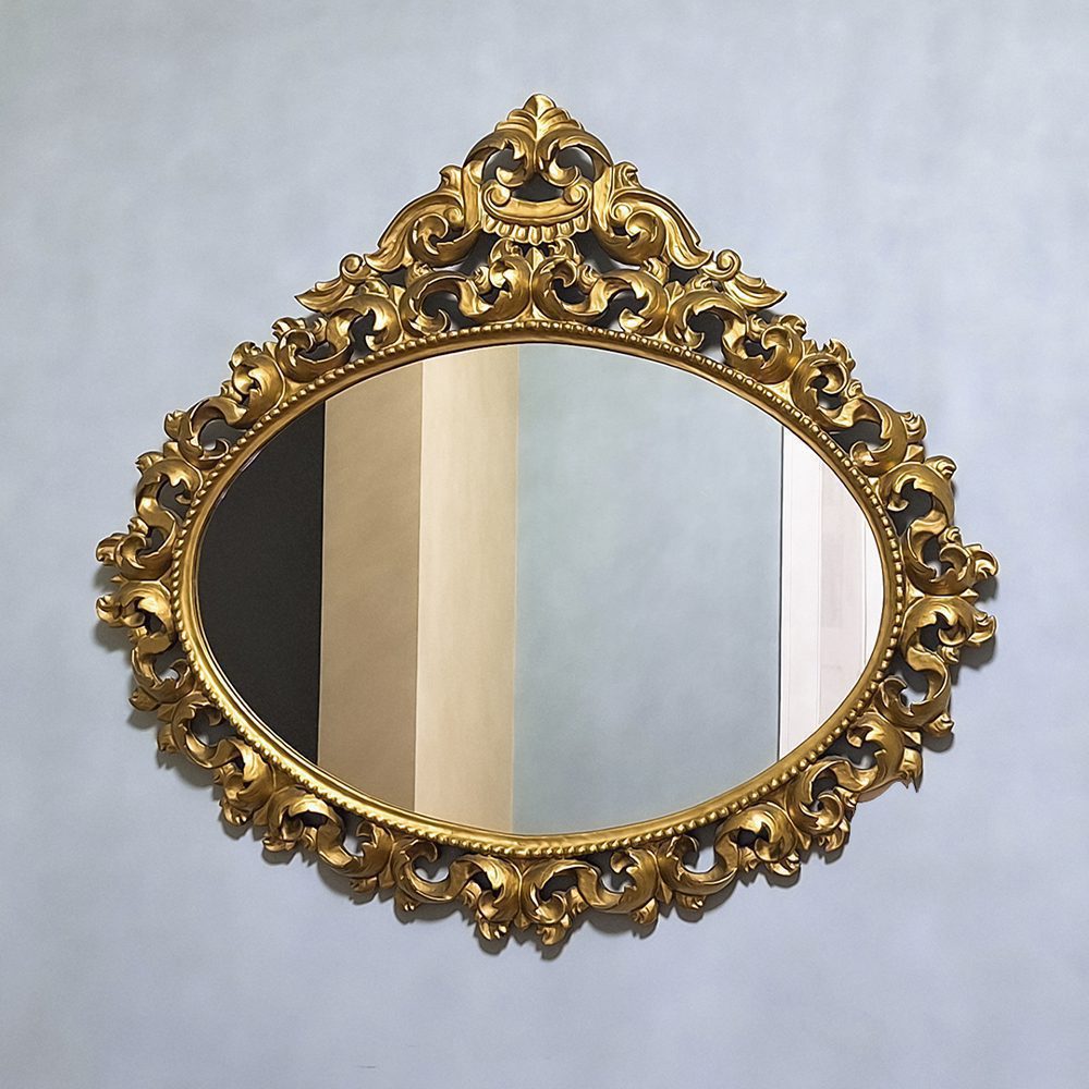 Su marco tallado a mano en dorado envejecido aporta majestuosidad y profundidad a cualquier ambiente. El diseño ovalado evoca los espejos de las casonas coloniales, combinando tradición y refinamiento.